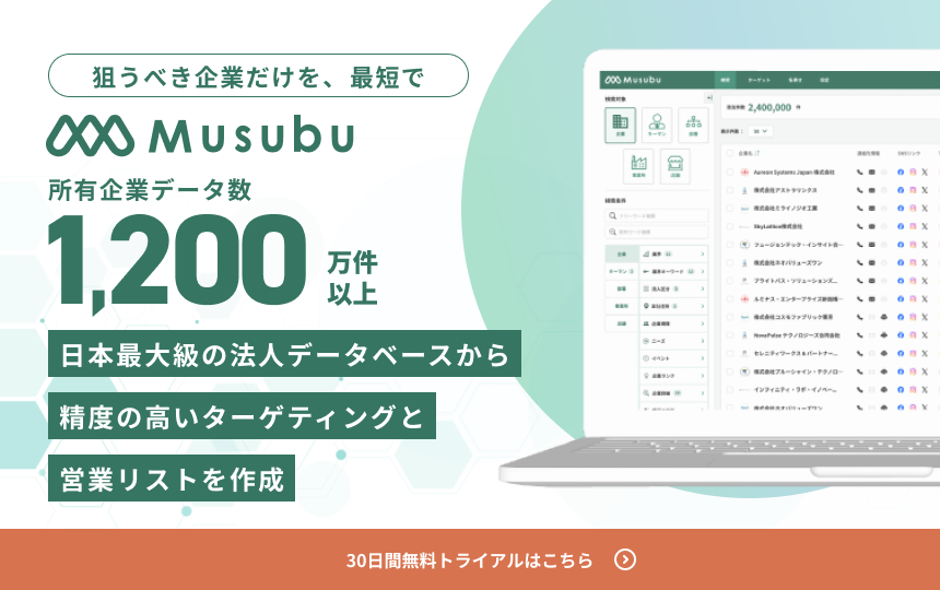 最後に、効果的に見込み客を獲得するために、ぜひ弊社が提供する営業リスト作成ツール「Musubu」をご活用ください。 業界や企業規模、設立年月から現在求人を出している企業まで、細かなセグメントでのリスト作成が可能です。